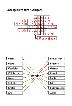 Die Arbeitsblätter enthalten ein Angebot verschiedener Aufgabenformen und beziehen sich auf den Filmausschnitt über den Baummarder: Bild- und Textzuordnungen, Satzpuzzle, Lückentexte, Bilder-Memospiel, Bild-Wort-Memospiel, Bild-Puzzle.